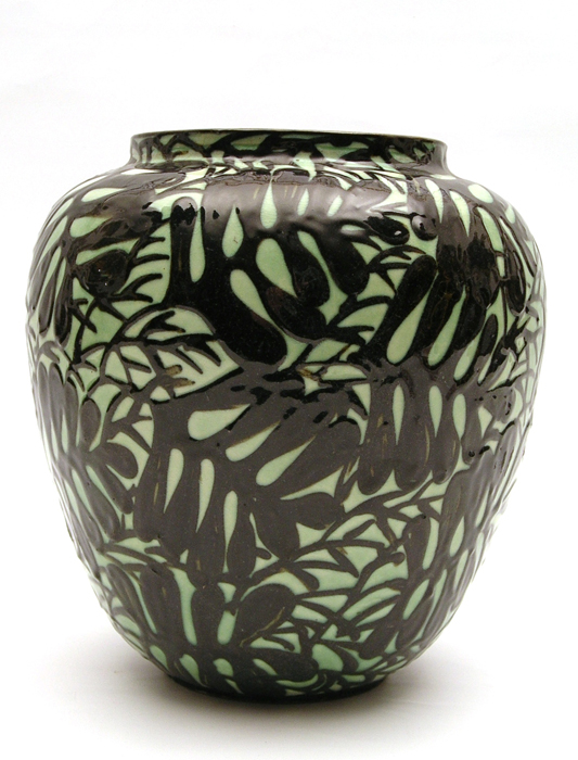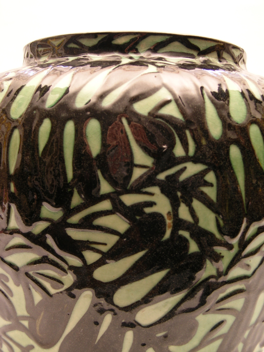 Der bauchige, hellgrün-grundige Vasenkörper wird überwuchert von einem Gewirr aus dunklen Ästen mit schmalen, nadelartigen und fleischigen, fiedrigen Blättern. Überlappungen und Überschneidungen unterstreichen den naturalistischen Charakter der Darstellung. Das Dekor wurde mit Schlicker, einer verflüssigten Tonmineralmasse, flach und malerisch aufgetragen. Die Vase geht auf einen Entwurf von Professor Max Laeuger zurück und wurde zwischen 1921 und 1923 in der Majolika Karlsruhe ausgeführt. Im Musterverzeichnis der Majolika wird sie unter der Modellnummer 1868 mit dem Titel „Blätter“ geführt.