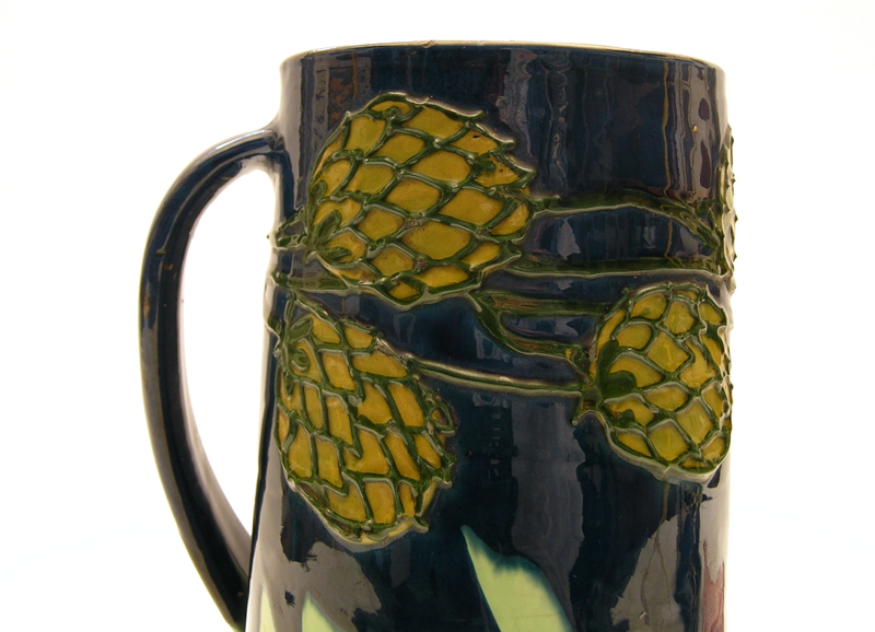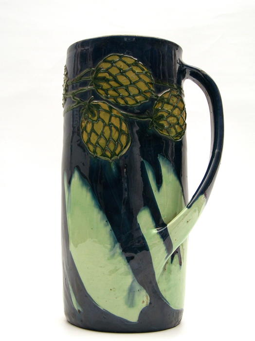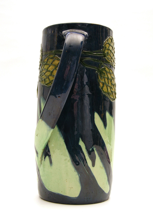 Der schlichte zylindrische Krug fällt durch die in kräftigen Farben gehaltene Laufglasur, den schwingenden Henkel und die in Schlickermalerei applizierten Beeren ins Auge. Alle drei Gestaltungsmerkmale verweisen auf den Jugendstil und seine gestalterische Experimentierfreude.
